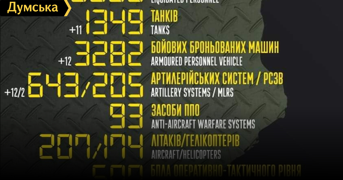 За сутки российские оккупанты потеряли в Украине 200 человек, две крылатые ракеты и 11 танков200 солдат, 11 танков и две РСЗО потеряли российские нацисты за минувшие сутки в Украине. Кроме того, как сообщает Генштаб Вооруженных сил, украинские защитники уничтожили 12 боевых бронированных машин, 12 артиллерийских систем, три БПЛА оперативно-тактического уровня, две крылатые ракеты и 18 единиц автомобильной техники. Всего с начала полномасштабного вторжения потери врага составили: личного состава — 30 350 человек; танков — 1349 единиц; боевых бронированных машин ‒ 3282 единицы; артиллерийских систем – 643 единицы; РСЗО — 205 единиц; средства ПВО - 93 единицы; самолетов – 207 единиц; вертолетов – 174 единицы; БПЛА оперативно-тактического уровня – 507; крылатые ракеты — 118; корабли/катера — 13 единиц; автомобильной техники и автоцистерн — 2258 единиц; специальная техника – 48. СМЕРТЬ РОСІЙСЬКИМ ОКУПАНТАМ! Помітили помилку? Виділяйте слова з помилкою та натискайте control-enter |