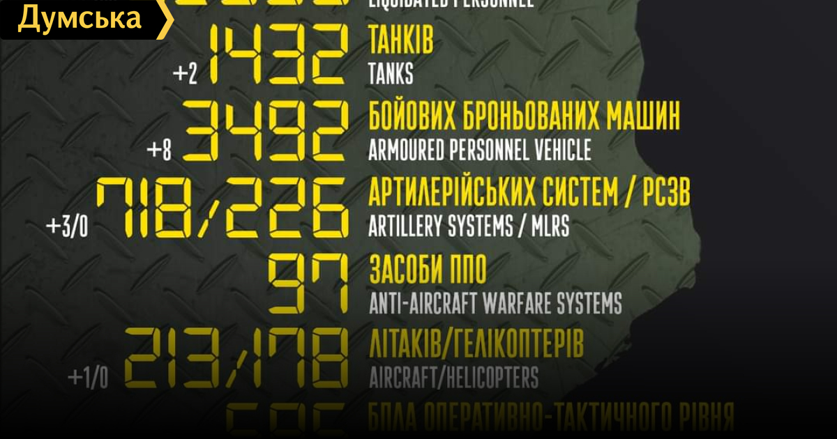 За сутки российские оккупанты потеряли в Украине 150 человек, два танка и один самолет150 солдат, два танка и один самолет потеряли российские нацисты за минувшие сутки в Украине. Кроме того, как сообщает Генштаб Вооруженных сил, украинские защитники уничтожили восемь боевых бронированных машин, три артиллерийские системы, три БПЛА оперативно-тактического уровня и пять единиц автомобильной техники. Всего с начала полномасштабного вторжения потери врага составили: личного состава — 32 300 человек; танков — 1432 единицы; боевых бронированных машин ‒ 3492 единицы; артиллерийских систем – 718 единиц; РСЗО — 226 единиц; средства ПВО - 97 единиц; самолетов – 213 единиц; вертолетов – 178 единиц; БПЛА оперативно-тактического уровня – 585; крылатые ракеты — 125; корабли/катера — 13 единиц; автомобильной техники и автоцистерн — 2460 единиц; специальная техника – 54. За минувшие сутки наибольшие потери наблюдались на бахмутском направлении. СМЕРТЬ РОСІЙСЬКИМ ОКУПАНТАМ! Помітили помилку? Виділяйте слова з помилкою та натискайте control-enter |