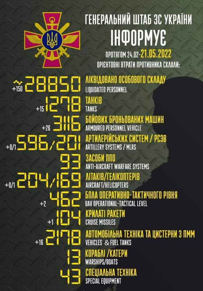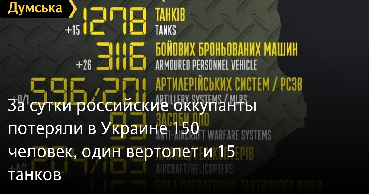 150 солдат, 15 танков и один вертолет потеряли российские нацисты за минувшие сутки в Украине.