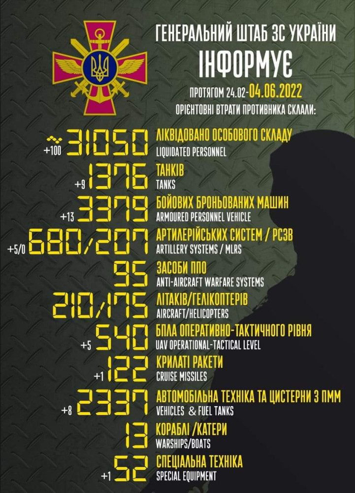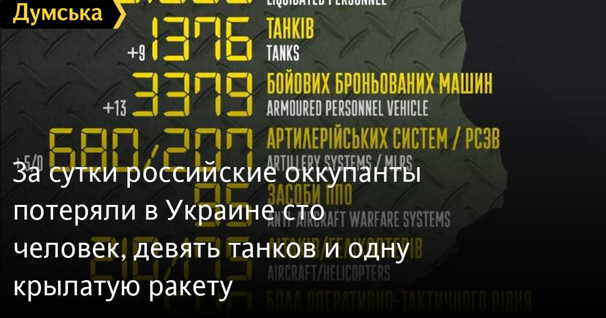Кроме того, как сообщает Генштаб Вооруженных сил, украинские защитники уничтожили 13 боевых бронированных машин, пять БПЛА оперативно-тактического уровня, одну крылатую ракету, восемь единиц автомобильной и одну единицу специальной техники.