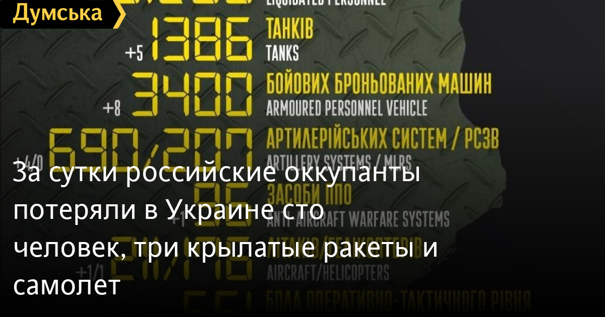 Кроме того, как сообщает Генштаб Вооруженных сил, украинские защитники уничтожили восемь боевых бронированных машин, четыре артиллерийские системы, одно средство ПВО, один вертолет, три БПЛА оперативно-тактического уровня, 35 единиц автомобильной техники и три крылатые ракеты.