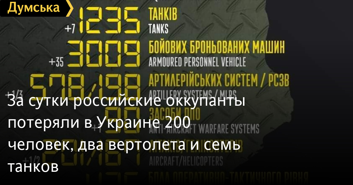 За сутки российские оккупанты потеряли в Украине 200 человек, два вертолета и семь танков200 солдат, семь танков и два вертолета потеряли российские нацисты за минувшие сутки в Украине. Кроме того, как сообщает Генштаб Вооруженных сил, украинские защитники уничтожили 35 боевых бронированных машин, одну артиллерийскую систему, три РСЗО, одно средство ПВО, один самолет, девять БПЛА оперативно-тактического уровня, восемь единиц автомобильной техники и одну единицу специальной техники. Всего с начала полномасштабного вторжения потери врага составили: личного состава — 27 900 человек; танков — 1235 единиц; боевых бронированных машин ‒ 3009 единиц; артиллерийских систем – 578 единиц; РСЗО — 198 единиц; средства ПВО - 90 единиц; самолетов – 201 единица; вертолетов – 167 единиц; БПЛА оперативно-тактического уровня – 436; крылатые ракеты — 97; корабли/катера — 13 единиц; автомобильной техники и автоцистерн — 2109 единиц; специальная техника – 43. СМЕРТЬ РОСІЙСЬКИМ ОКУПАНТАМ! Помітили помилку? Виділяйте слова з помилкою та натискайте control-enter |