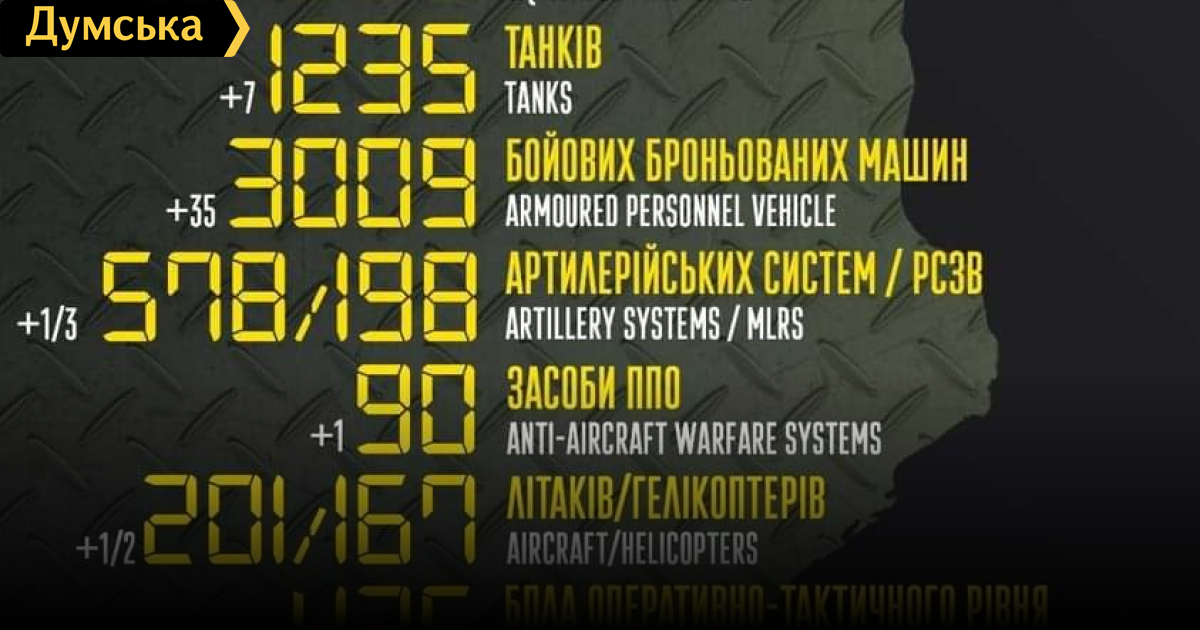 За сутки российские оккупанты потеряли в Украине 200 человек, два вертолета и семь танков200 солдат, семь танков и два вертолета потеряли российские нацисты за минувшие сутки в Украине. Кроме того, как сообщает Генштаб Вооруженных сил, украинские защитники уничтожили 35 боевых бронированных машин, одну артиллерийскую систему, три РСЗО, одно средство ПВО, один самолет, девять БПЛА оперативно-тактического уровня, восемь единиц автомобильной техники и одну единицу специальной техники. Всего с начала полномасштабного вторжения потери врага составили: личного состава — 27 900 человек; танков — 1235 единиц; боевых бронированных машин ‒ 3009 единиц; артиллерийских систем – 578 единиц; РСЗО — 198 единиц; средства ПВО - 90 единиц; самолетов – 201 единица; вертолетов – 167 единиц; БПЛА оперативно-тактического уровня – 436; крылатые ракеты — 97; корабли/катера — 13 единиц; автомобильной техники и автоцистерн — 2109 единиц; специальная техника – 43. СМЕРТЬ РОСІЙСЬКИМ ОКУПАНТАМ! Помітили помилку? Виділяйте слова з помилкою та натискайте control-enter |