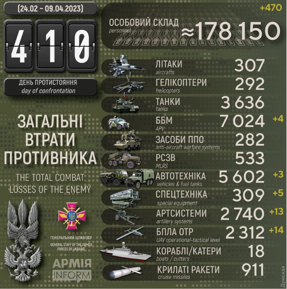 Крім того, за даними Генерального штабу Збройних сил України, наші захисники також знищили чотири бойові броньовані машини, три одиниці автомобільної техніки та п'ять — спеціальної.
