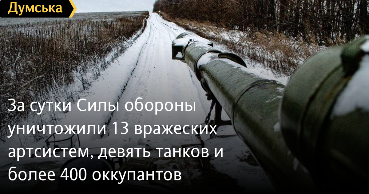 За добу Сили оборони знищили 13 ворожих артсистем, дев`ять танків та понад 400 окупантів440 осіб, одну крилату ракету та дев'ять танків втратили російські окупанти минулої доби. Крім того, за даними Генерального штабу Збройних сил України, наші захисники також знищили 14 бойових броньованих машин, 13 артсистем, дві РСЗВ, один засіб ППО, 11 БПЛА оперативно-тактичного рівня, 19 одиниць автомобільної техніки та одну одиницю спецтехніки. Усього з початку повномасштабного вторгнення втрати ворога склали: особового складу — 365 170 осіб; танків ‒ 6031 одиницю; бойових броньованих машин ‒ 11194 одиниці; артилерійських систем – 8666 одиниць; РСЗВ – 953 одиниці; засоби ППО ‒ 638 одиниць; літаків – 329 одиниць; гелікоптерів – 324 одиниці; БПЛА оперативно-тактичного рівня – 6822; крилаті ракети ‒ 1787; кораблі /катери ‒ 23 одиниці; підводні човни — 1 одиницю; автомобільної техніки та автоцистерн – 11542 одиниці; спеціальна техніка ‒ 1328. СМЕРТЬ РОСІЙСЬКИМ ОКУПАНТАМ! Помітили помилку? Виділяйте слова з помилкою та натискайте control-enter |
