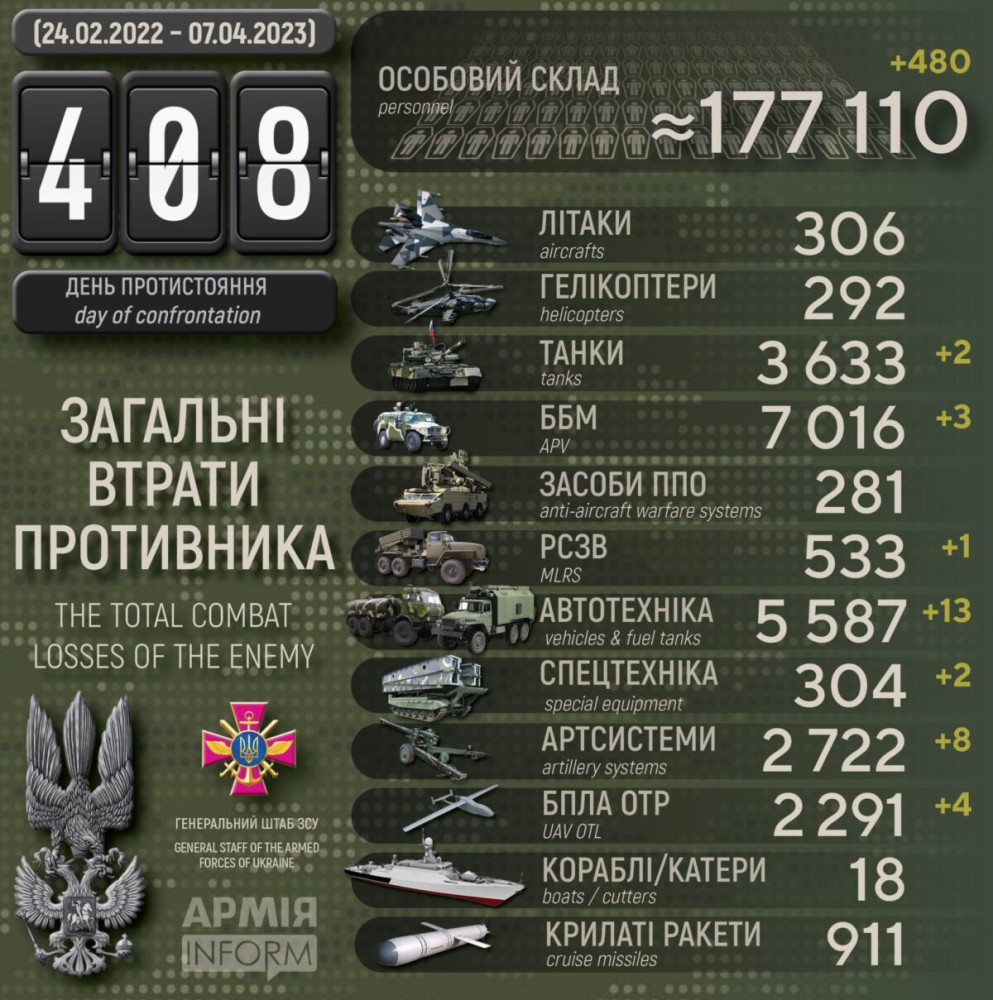 За добу Сили оборони знищили чотири ворожі безпілотники, вісім артсистем і майже 500 окупантів480 осіб, два танки і вісім артсистем втратили окупанти в Україні за минулу добу. Крім того, за даними Генерального штабу Збройних сил України, наші захисники також знищили три бойові броньовані машини, одну РСЗВ, чотири БПЛА оперативно-тактичного рівня, 13 одиниць автомобільної техніки і дві одиниці спецтехніки. Усього з початку повномасштабного вторгнення втрати ворога склали: особового складу — 177 110 осіб; танків ‒ 3633 одиниці; бойових броньованих машин ‒ 7016 одиниць; артилерійських систем – 2722 одиниці; РСЗВ – 533 одиниці; засоби ППО ‒ 281 одиницю; літаків – 306 одиниць; гелікоптерів – 292 одиниці; БПЛА оперативно-тактичного рівня – 2291; крилаті ракети ‒ 911; кораблі /катери ‒ 18 одиниць; автомобільної техніки та автоцистерн – 5587 одиниць; спеціальна техніка ‒ 304. СМЕРТЬ РОСІЙСЬКИМ ОКУПАНТАМ! Помітили помилку? Виділяйте слова з помилкою та натискайте control-enter |
