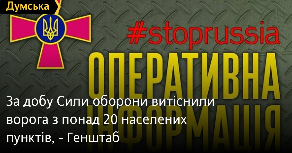 Загалом, за минулу добу, Силам оборони вдалось витіснити ворога з понад 20 населених пунктів. Проводиться взяття їх під повний контроль та стабілізаційні заходи.