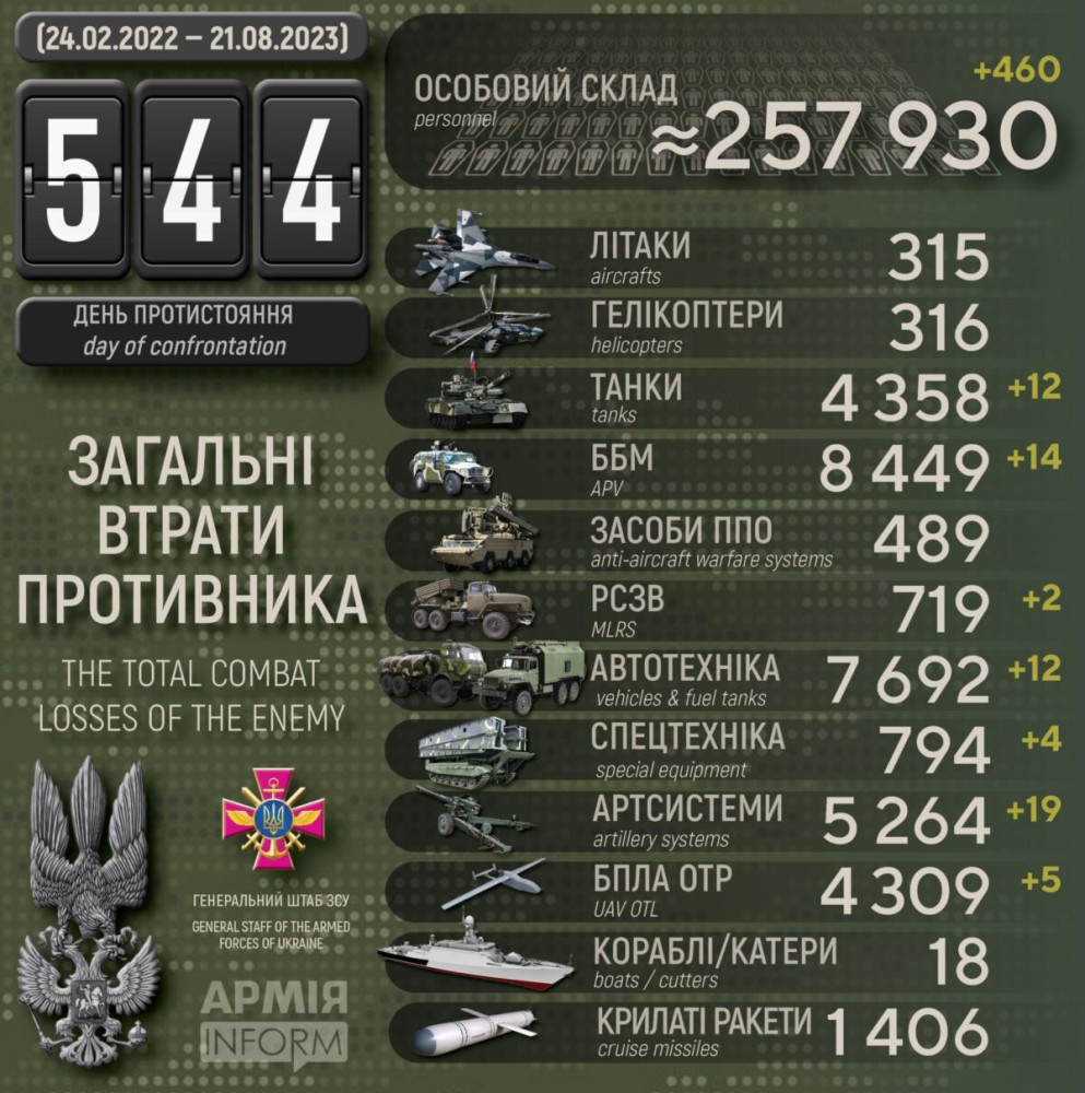 Крім того, за даними Генерального штабу Збройних сил України, наші захисники також знищили 14 бойових броньованих машин, дві РСЗВ, п'ять БПЛА оперативно-тактичного рівня, 12 одиниць автомобільної техніки і чотири одиниці спецтехніки.
