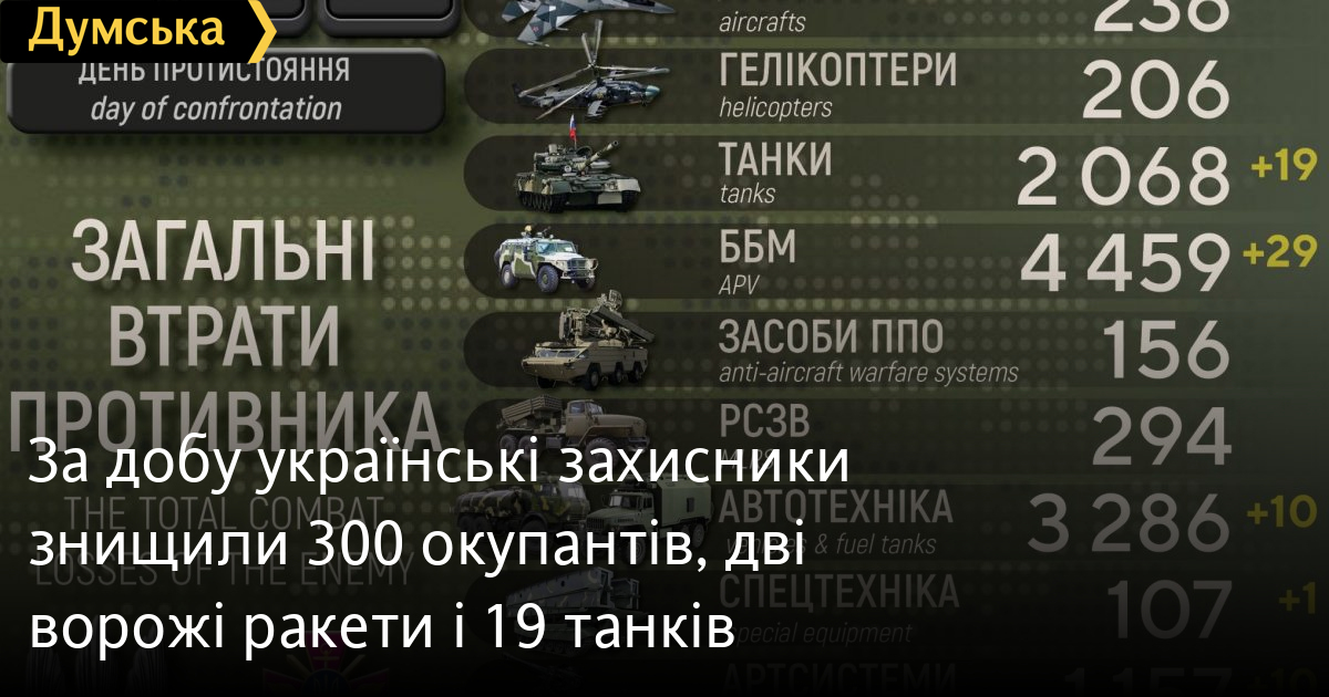 300 осіб, 19 танків і дві крилаті ракети втратили окупанти за минулу добу в Україні.