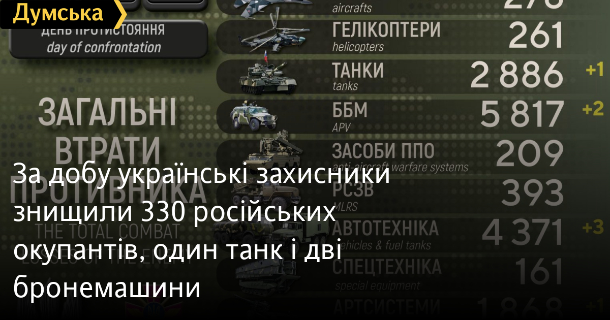 330 осіб, один танк і одну артсистему втратили окупанти в Україні за минулу добу.