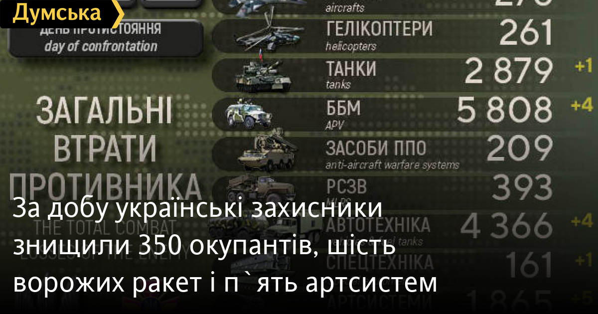 350 осіб, шість крилатих ракет і п'ять артсистем втратили окупанти в Україні за минулу добу.