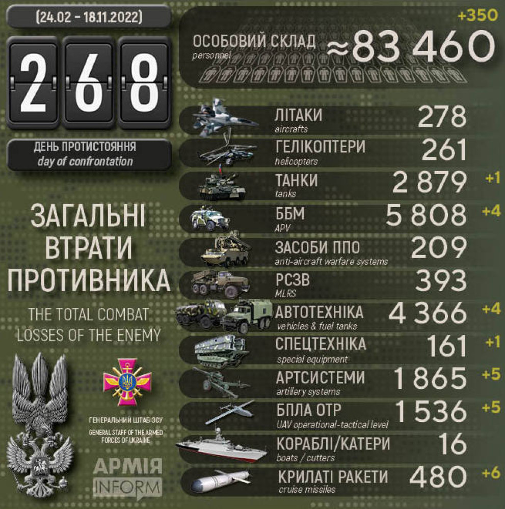 Усього з початку повномасштабного вторгнення втрати ворога склали:
