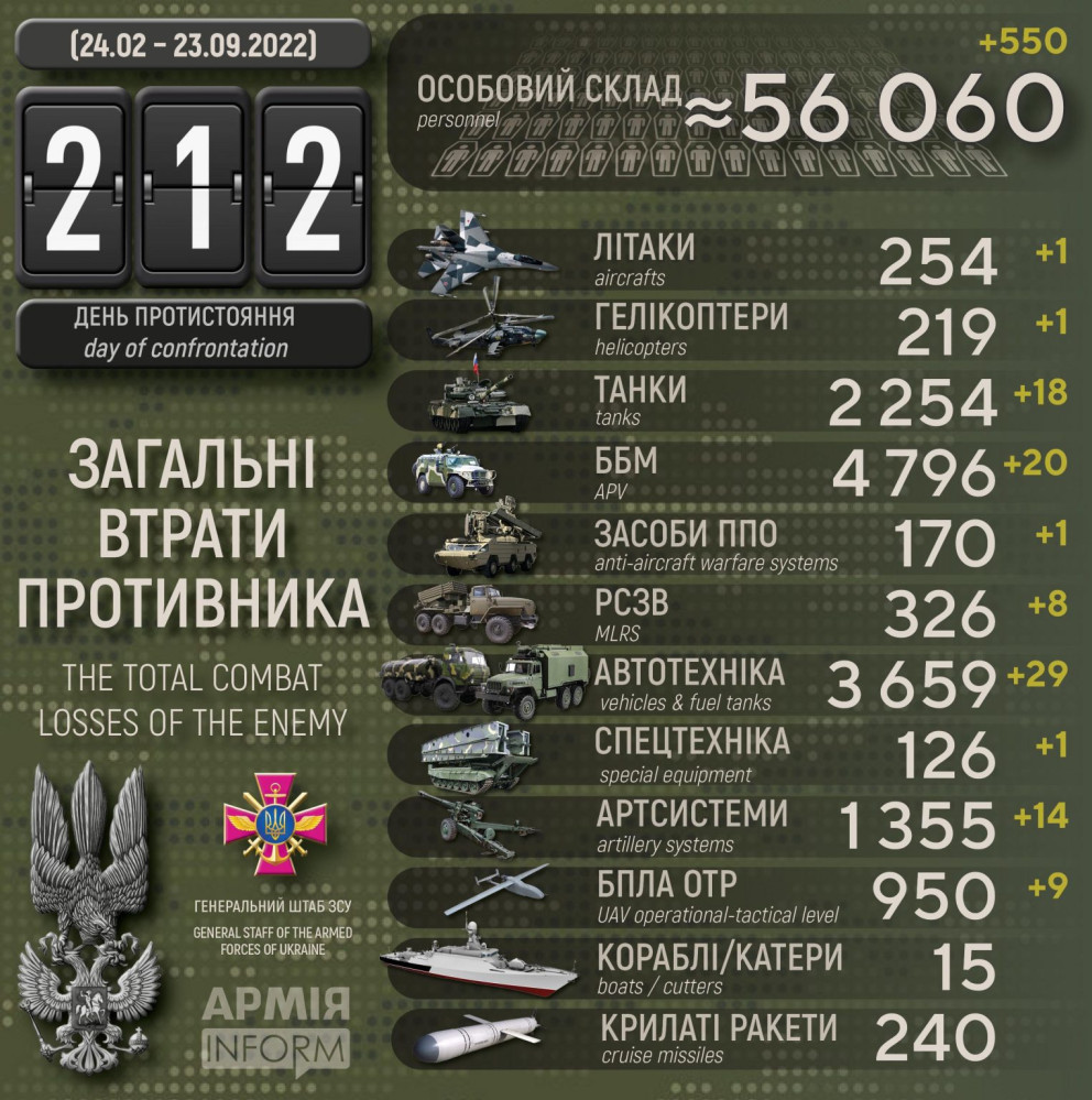 Крім того, за даними Генерального штабу Збройних сил України, наші захисники також знищили 18 танків, 20 бойових броньованих машин, 14 артсистем, вісім РСЗВ, один ППО, дев'ять БПЛА оперативно-тактичного рівня, 29 одиниць автомобільної техніки і одну одиницю спецтехніки.