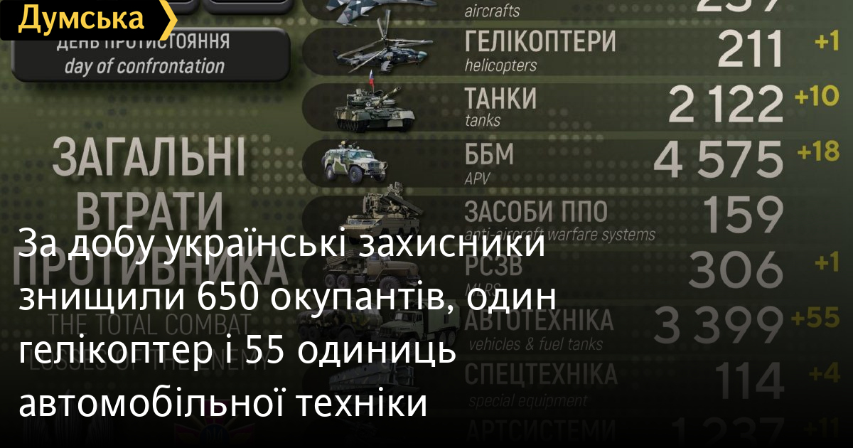 650 осіб, один гелікоптер і десять танків втратили окупанти за минулу добу в Україні.