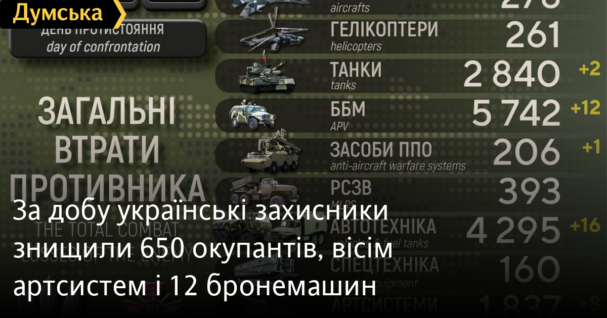 650 осіб, два танки і вісім артсистем втратили окупанти в Україні за минулу добу.
