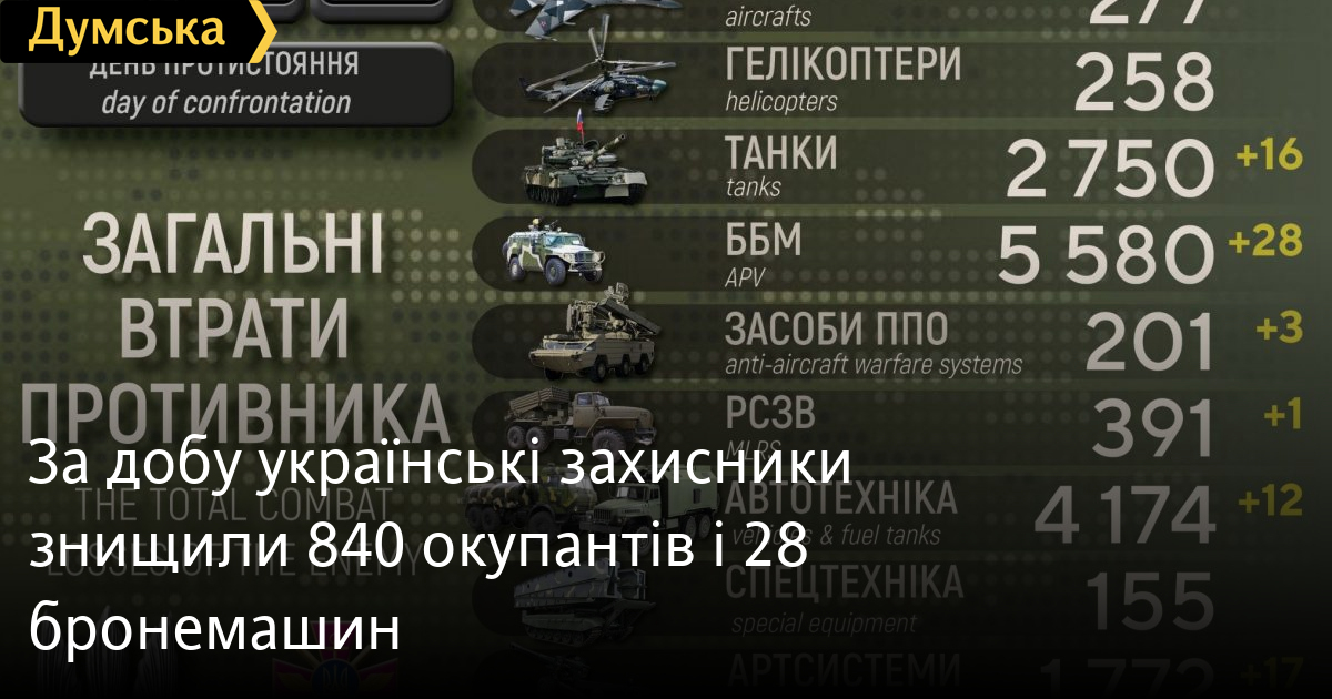 840 осіб, 16 танків і 28 бойових броньованих машин втратили окупанти в Україні за минулу добу.