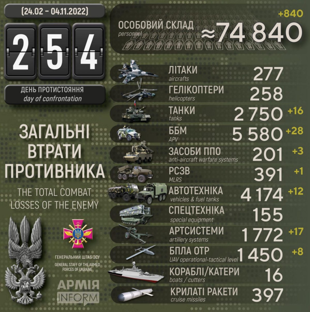 Усього з початку повномасштабного вторгнення втрати ворога склали: