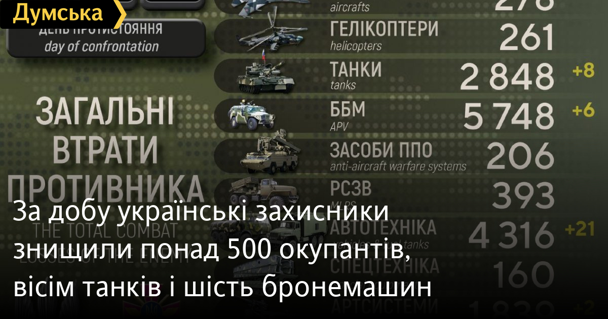 Крім того, за даними Генерального штабу Збройних сил України, наші захисники також знищили шість бойових броньованих машин, два БПЛА оперативно-тактичного рівня і 21 одиницю автомобільної техніки.