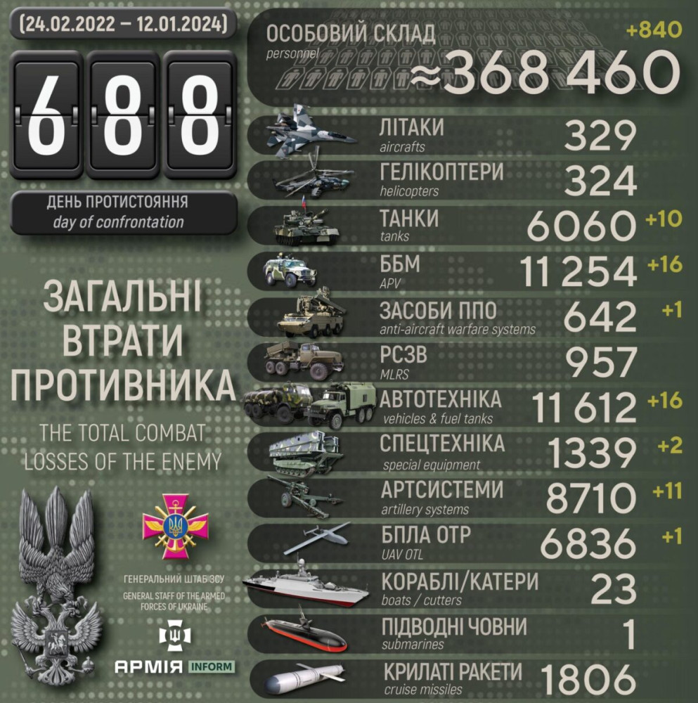 За добу українські захисники знищили десять ворожих танків, 16 бронемашин та понад 800 окупантів840 осіб, десять танків та 11 артсистем втратили російські окупанти минулої доби. Крім того, за даними Генерального штабу Збройних сил України, наші захисники також знищили 16 бойових броньованих машин, один засіб ППО, один БПЛА оперативно-тактичного рівня, 16 одиниць автомобільної техніки та дві одиниці спецтехніки. Усього з початку повномасштабного вторгнення втрати ворога склали: особового складу — 368 460 осіб; танків ‒ 6060 одиниць; бойових броньованих машин ‒ 11254 одиниці; артилерійських систем – 8710 одиниць; РСЗВ – 957 одиниць; засоби ППО ‒ 642 одиниці; літаків – 329 одиниць; гелікоптерів – 324 одиниці; БПЛА оперативно-тактичного рівня — 6836; крилаті ракети ‒ 1806; кораблі /катери ‒ 23 одиниці; підводні човни — 1 одиницю; автомобільної техніки та автоцистерн – 11612 одиниць; спеціальна техніка ‒ 1339. СМЕРТЬ РОСІЙСЬКИМ ОКУПАНТАМ! Помітили помилку? Виділяйте слова з помилкою та натискайте control-enter |