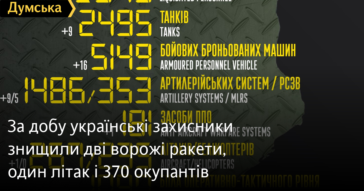 370 осіб, дві крилаті ракети і один літак втратили окупанти за минулу добу в Україні.