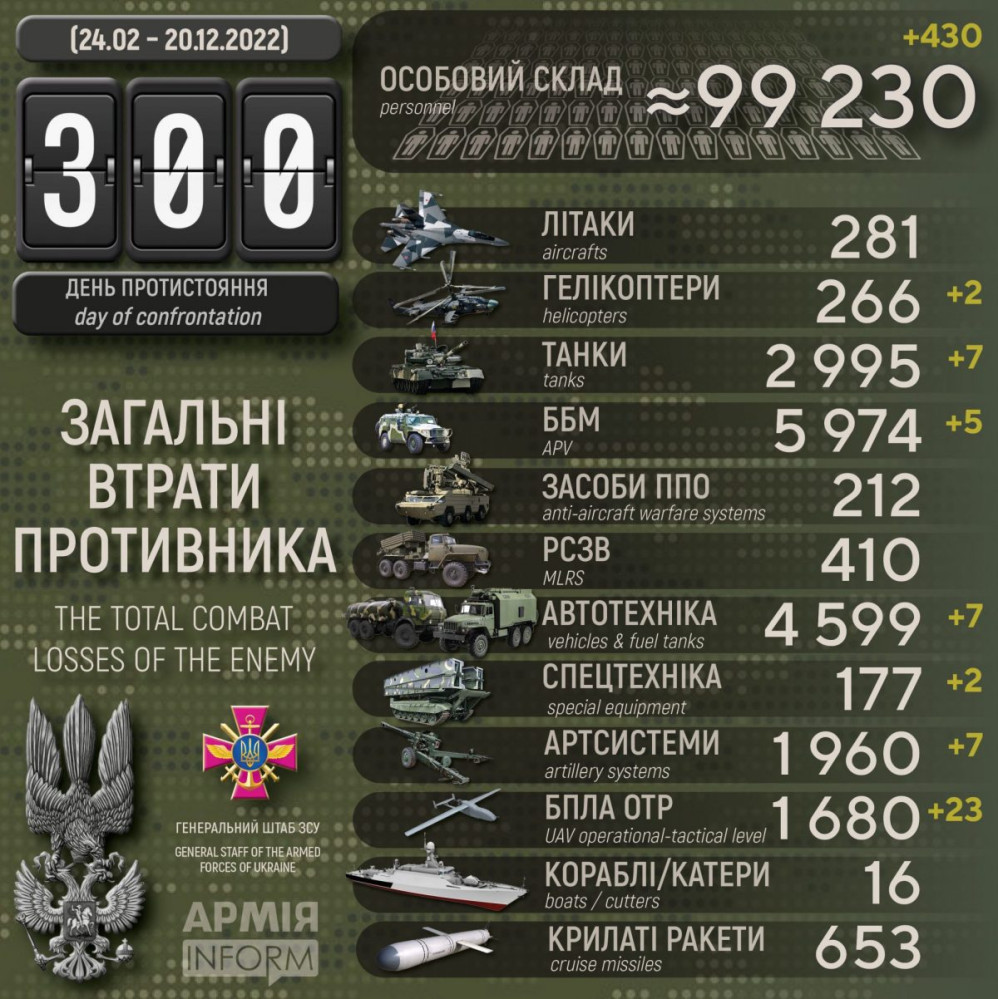 За сутки украинские защитники уничтожили два вражеских вертолета, 23 беспилотника и более 400 оккупантов430 человек, семь танков и два вертолета потеряли оккупанты в Украине за минувшие сутки. Кроме того, по данным Генерального штаба Вооруженных сил Украины, наши защитники уничтожили пять боевых бронированных машин, семь артсистем, 23 БПЛА оперативно-тактического уровня, семь единиц автомобильной техники и две единицы спецтехники. Всего с начала полномасштабного вторжения потери врага составили: личного состава – 99 230 человек; танков – 2995 единиц; боевых бронированных машин – 5974 единицы; артиллерийских систем – 1960 единиц; РСЗО – 410 единиц; средства ПВО – 212 единиц; самолетов – 281 единица; вертолетов – 266 единиц; БПЛА оперативно-тактического уровня – 1680; крылатые ракеты – 653; корабли /катера – 16 единиц; автомобильной техники и автоцистерн – 4599 единиц; специальная техника – 177. СМЕРТЬ РОССИЙСКИМ ОККУПАНТАМ! Заметили ошибку? Выделяйте слова с ошибкой и нажимайте control-enter |