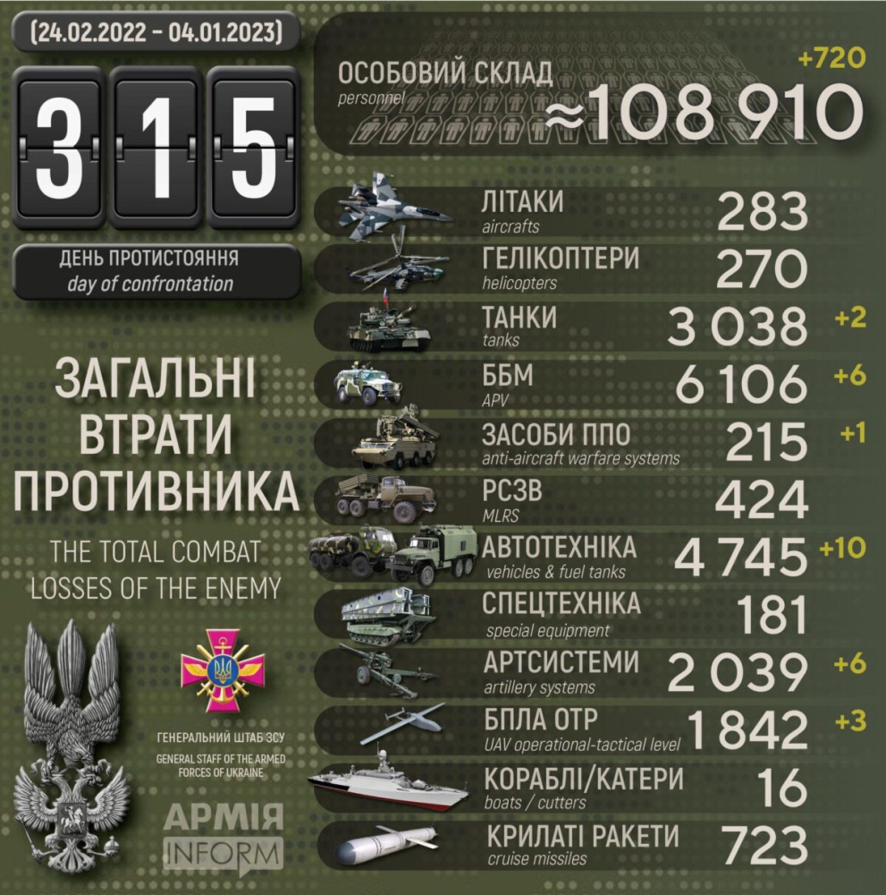 Усього з початку повномасштабного вторгнення втрати ворога склали: