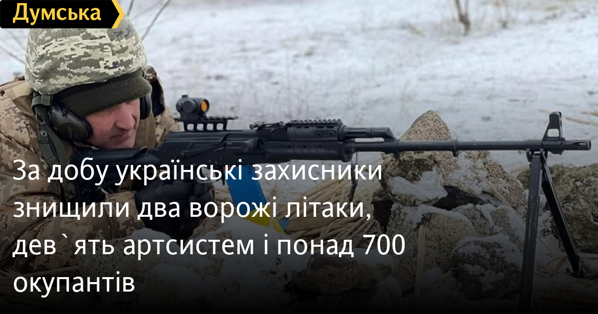 За добу українські захисники знищили два ворожі літаки, дев`ять артсистем і понад 700 окупантів740 осіб, два літаки і три танки втратили окупанти в Україні за минулу добу. Крім того, за даними Генерального штабу Збройних сил України, наші захисники також знищили вісім бойових броньованих машин, дев'ять артсистем, одну РСЗВ, чотири БПЛА оперативно-тактичного рівня, п'ять одиниць автомобільної техніки і одну одиницю спецтехніки. Усього з початку повномасштабного вторгнення втрати ворога склали: особового складу — 139 080 осіб; танків ‒ 3286 одиниць; бойових броньованих машин ‒ 6500 одиниць; артилерійських систем – 2299 одиниць; РСЗВ – 466 одиниць; засоби ППО ‒ 234 одиниці; літаків – 298 одиниць; гелікоптерів – 286 одиниць; БПЛА оперативно-тактичного рівня – 2011; крилаті ракети ‒ 857; кораблі /катери ‒ 18 одиниць; автомобільної техніки та автоцистерн – 5155 одиниць; спеціальна техніка ‒ 218. СМЕРТЬ РОСІЙСЬКИМ ОКУПАНТАМ! Помітили помилку? Виділяйте слова з помилкою та натискайте control-enter |