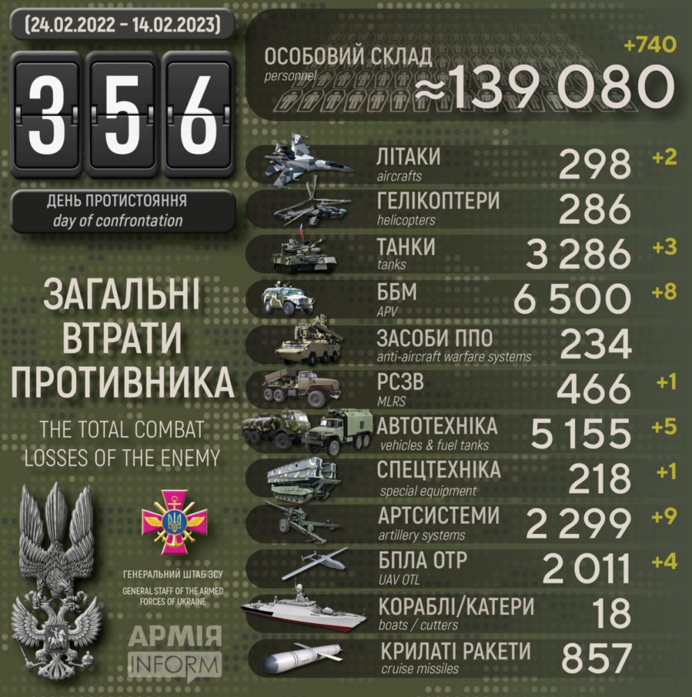 Крім того, за даними Генерального штабу Збройних сил України, наші захисники також знищили вісім бойових броньованих машин, дев'ять артсистем, одну РСЗВ, чотири БПЛА оперативно-тактичного рівня, п'ять одиниць автомобільної техніки і одну одиницю спецтехніки.