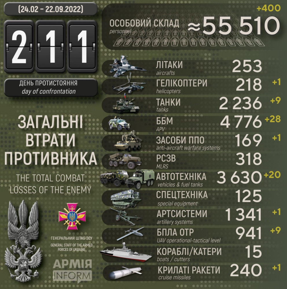 Крім того, за даними Генерального штабу Збройних сил України, наші захисники також знищили дев'ять танків, 28 бойових броньованих машин, одну артсистему, один засіб ППО, дев'ять БПЛА оперативно-тактичного рівня і 20 одиниць автомобільної техніки.