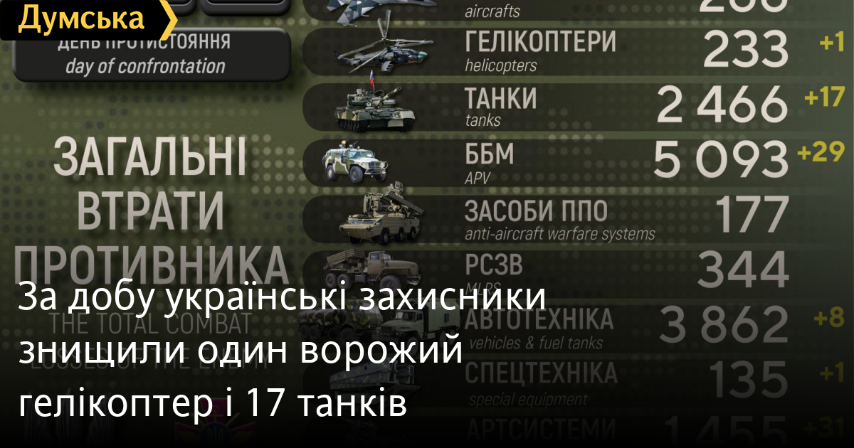 350 осіб, 17 танків і один гелікоптер втратили окупанти за минулу добу в Україні.