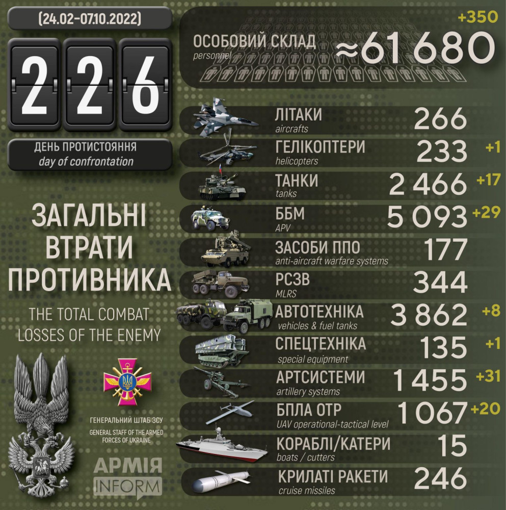 Усього з початку повномасштабного вторгнення втрати ворога склали: