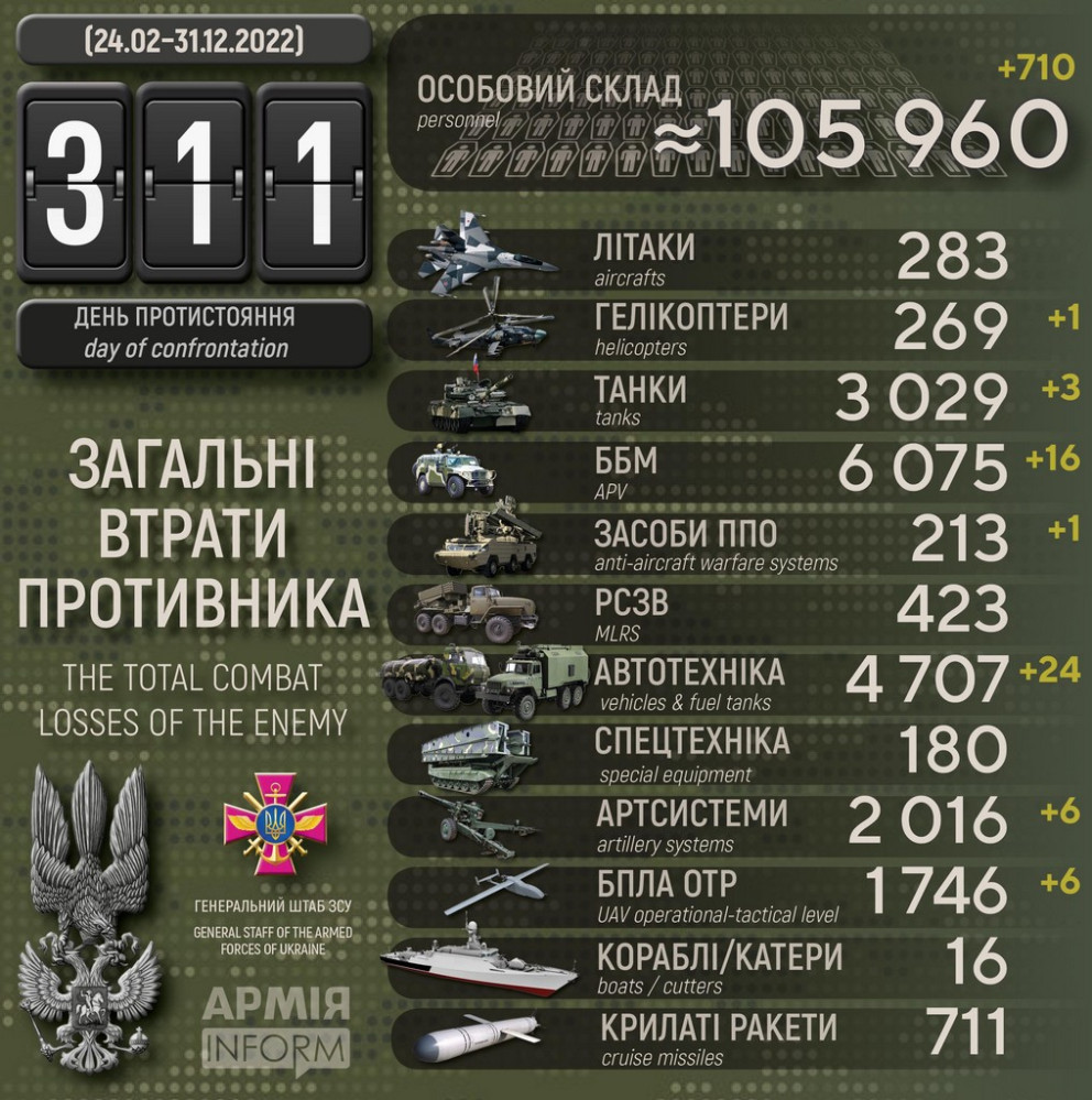Усього з початку повномасштабного вторгнення втрати ворога склали: