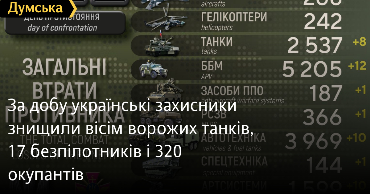 320 осіб, вісім танків і десять артсистем втратили окупанти в Україні за минулу добу.
