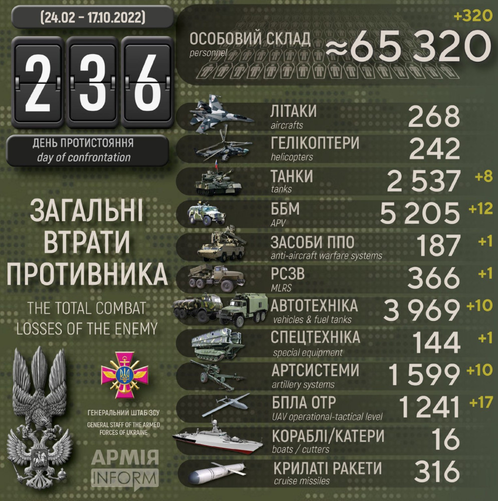 Крім того, за даними Генерального штабу Збройних сил України, наші захисники також знищили 12 бойових броньованих машин, одну РСЗВ, один засіб ППО, 17 БПЛА оперативно-тактичного рівня, десять одиниць автомобільної техніки і одну одиницю спецтехніки.