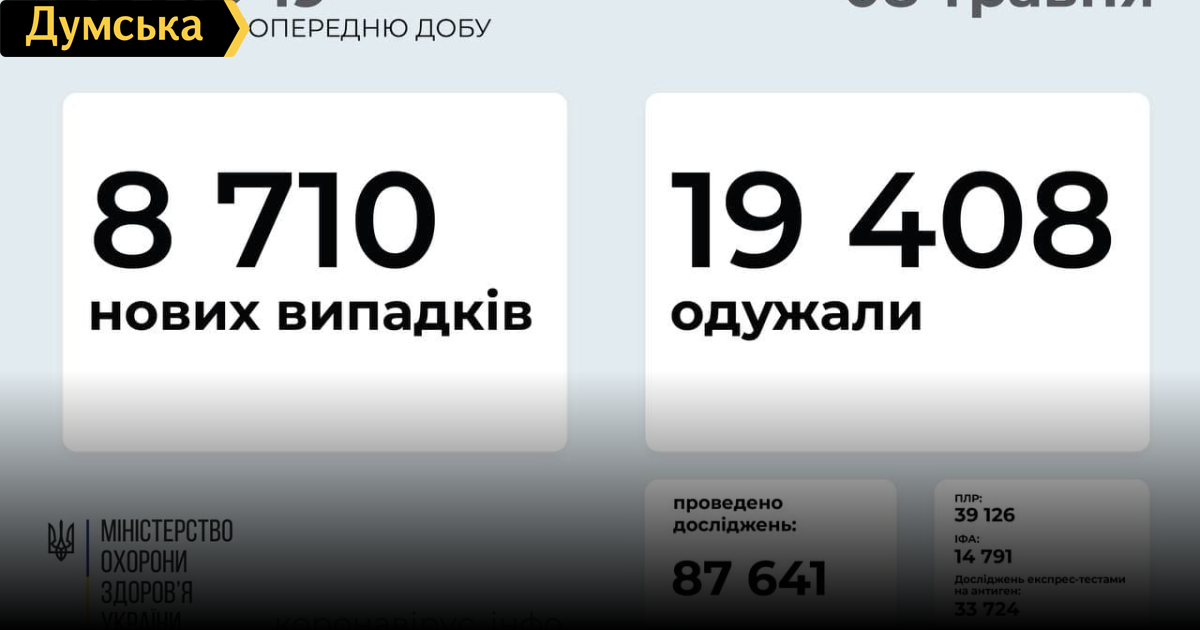 8710 заболевших COVID-19 зафиксировали 7 мая в Украине. Наивысшие показатели распространения инфекции в Днепропетровской области — 668 инфицированных за сутки. За все время в стране «ковид» зафиксировали у 2114138 человек. По данным Минздрава, за минувшие сутки от осложнений коронавирусной инфекции скончались 370 жителей Украины (46200 за все время). Наивысшая летальность вчера была в Донецкой области — 39 умерших за сутки. 19408 пациентов вчера вылечились от «ковида» (1750570 с начала пандемии). Больше всего вчера выздоровело людей в Запорожской области — 1652. Коечный фонд «ковидных» больниц по стране занят на 38,4% (29938 койки из доступных 78010). За сутки вакцины от «ковида» получили 36028 жителей Украины (857796 за всю кампанию вакцинации). Вторую дозу вакцины пока получили 446 украинцев. СМЕРТЬ РОСІЙСЬКИМ ОКУПАНТАМ! Помітили помилку? Виділяйте слова з помилкою та натискайте control-enter Новини по цій темі: 4 березня 2023: "Вакцини-довгожителі", або Як щеплення проти COVID-19 перетворилися в Україні на небезпечний ритуал 27 січня 2023: МОЗ зобов`язали опублікувати договори на закупівлю вакцин проти COVID-19: апеляційний суд задовольнив позов журналіста "Думської" 11 січня 2023: За тиждень в Одесі зафіксовано 159 випадків ковіду 4 січня 2023: За тиждень в Одесі зареєстровано 113 випадків ковіду |
