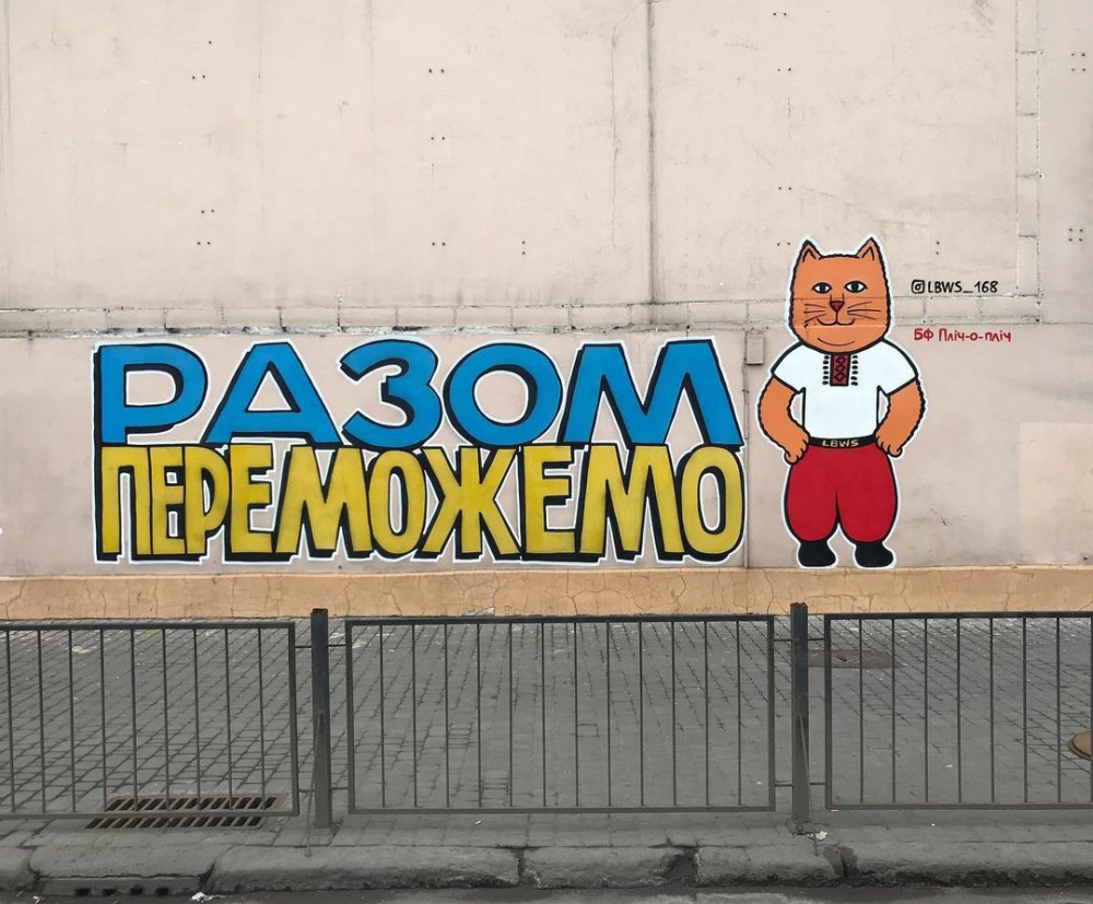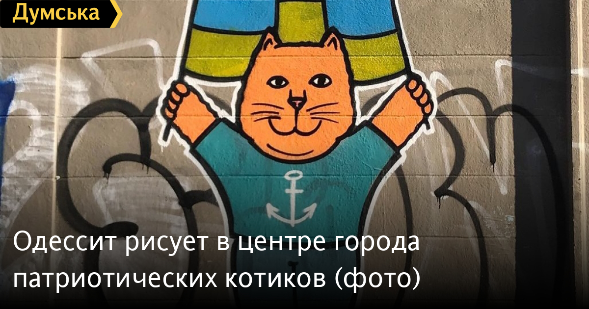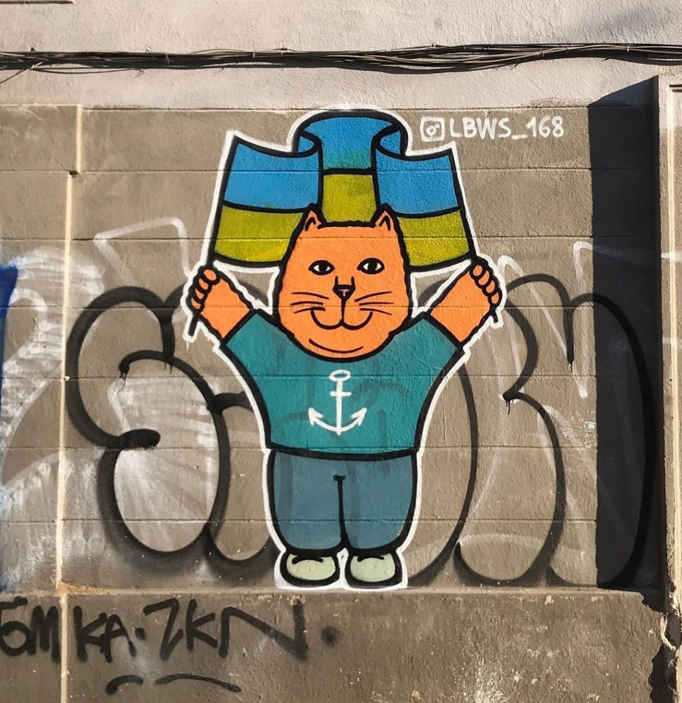 Известный уличный художник Игорь Матроскин украшает Одессу патриотическими муралами – это колоритные коты с украинскими флагами, в шароварах и с победными призывами.