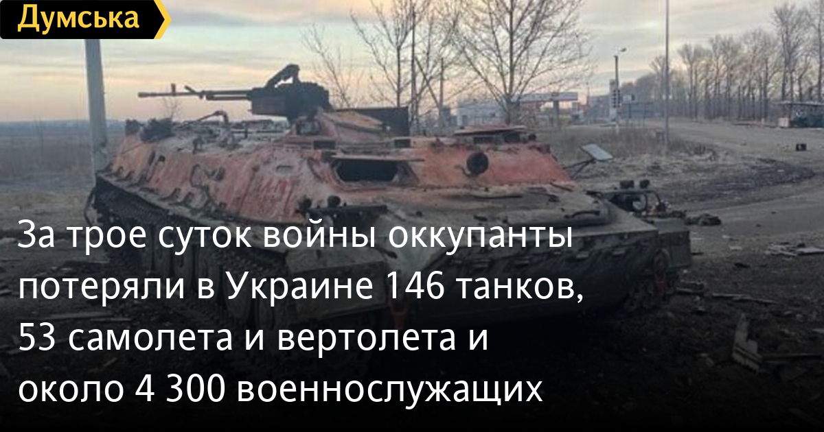 Суммарные ориентировочные потери врага за трое суток захватнической войны Российской Федерации в Украине: 706 боевых бронированных машин, 146 танков, 49 пушек, 27 самолетов и 26 вертолетов, сообщает замминистра обороны Анна Маляр. Кроме того, оккупанты потеряли зенитно-ракетный комплекс «Бук» и четыре «града», 30 авто и 60 цистерн с топливом, два дрона и столько же кораблей/катеров.