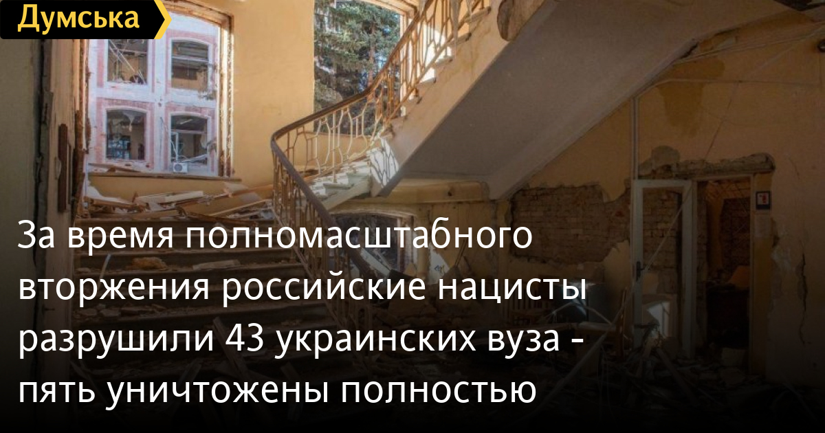 43 высших учебных заведения Украины получили повреждения в результате обстрелов российских войск, пять вузов уничтожены полностью.