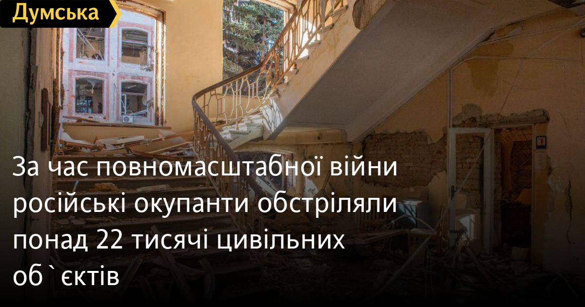 Понад 22 тисячі цивільних об'єктів обстріляли з початку повномасштабного військового вторгнення на територію України російські окупанти. Серед зруйнованих об'єктів – лікарні, пологові будинки, школи, дитсадки, університети, храми, музеї, театри, адміністративні будівлі, торгові центри, житлові будинки тощо.