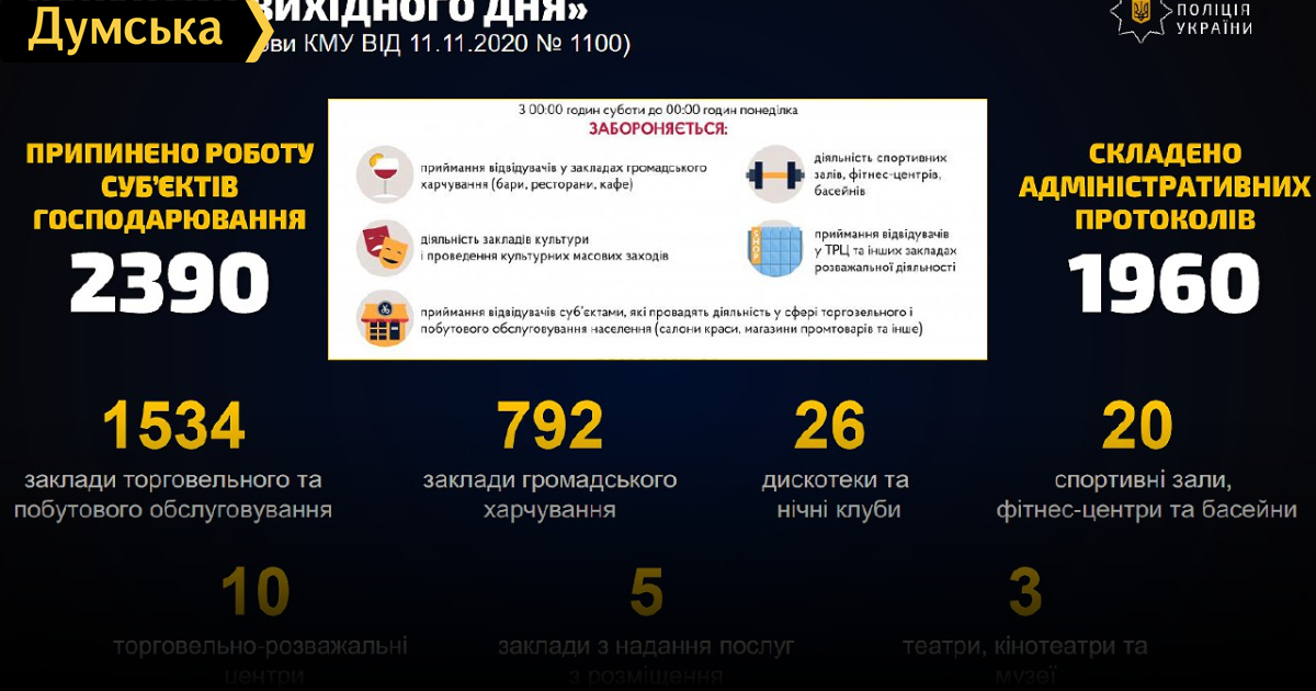 За выходные полиция закрыла почти 2,5 тысячи объектов за нарушение карантинаЗа минувшие выходные украинские правоохранители закрыли более 2 тысяч 400 объектов за нарушение карантина выходного дня. Об этом сообщила пресс-служба Нацполиции Украины. По словам главы Нацполиции Игоря Клименко, наибольшее количество нарушений было зафиксировано в тех регионах, где местная власть отказалась соблюдать карантин выходного дня. Речь идет о Львовской, Днепропетровской, Тернопольской, Черкасской и Одесской областях. Также много нарушений было выявлено в Киеве и Киевской области. В общем за субботу-воскресенье полиция закрыла более 2400 объектов, которые работали вопреки постановлению Кабинета министров. «Среди них более 1,5 тысячи предприятий торговли, почти 800 заведений питания, около 30 ночных клубов и 20 спортзалов», — подчеркнул Клименко. Он добавил, что правоохранители за эти два дня составил почти две тысячи административных протоколов и открыла девять уголовных производств. СМЕРТЬ РОСІЙСЬКИМ ОКУПАНТАМ! Помітили помилку? Виділяйте слова з помилкою та натискайте control-enter |