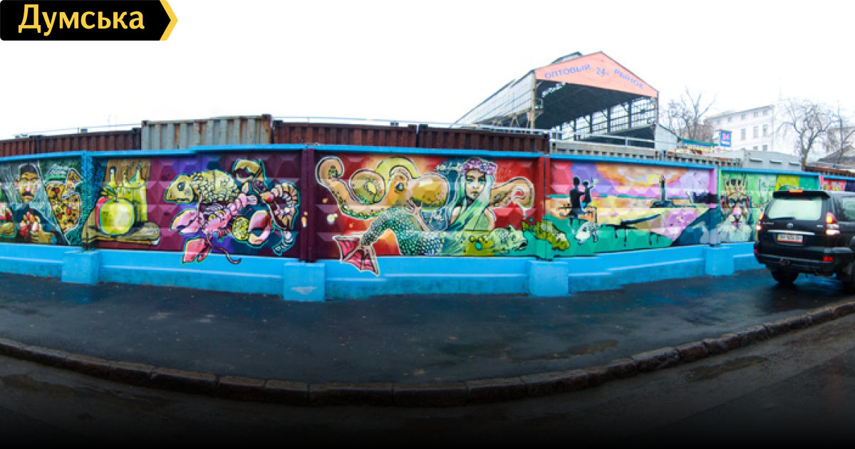 Как рассказал «Думской» директор рынка Сергей Колодько, идея разрисовать ограду принадлежит собственнику «Нового» — президенту концерна «Веселка» Месропу Хачатряну, который обратился за помощью к учащимся художественного училища имени М.Б. Грекова.