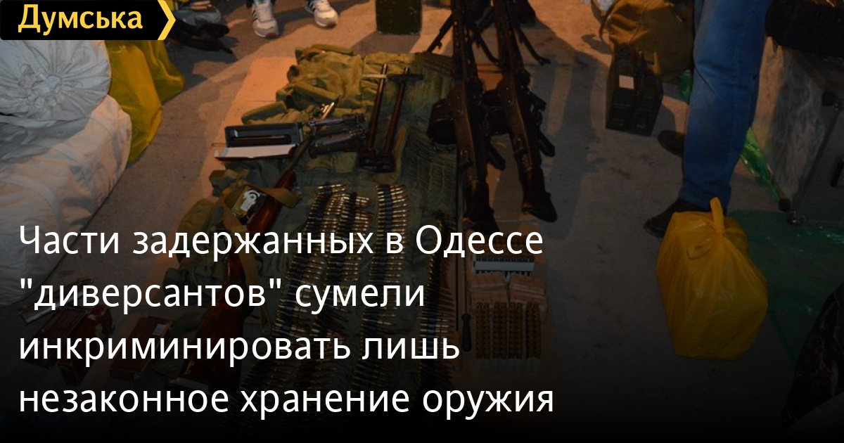 В сообщении пресс-центра СБУ отмечалось, что у мужчины нашли целый арсенал: «У него изъяли значительный арсенал: два ручных пулемета MG-42, два автомата АКМС, снайперскую винтовку Драгунова, спортивную винтовку ТОЗ-8, обрез охотничьего ружья, пять глушителей, сигнальный пистолет, пять тысяч патронов, 6 бронежилетов и семь единиц холодного оружия. Также оперативники нашли большое количество военной амуниции и снаряжения. По факту подготовки к совершению теракта следственный отдел УСБУ в Одесской области открыл уголовное производство по ч.1 ст. 14 и ч.2 ст. 258 УК Украины».