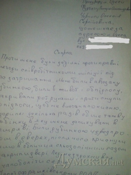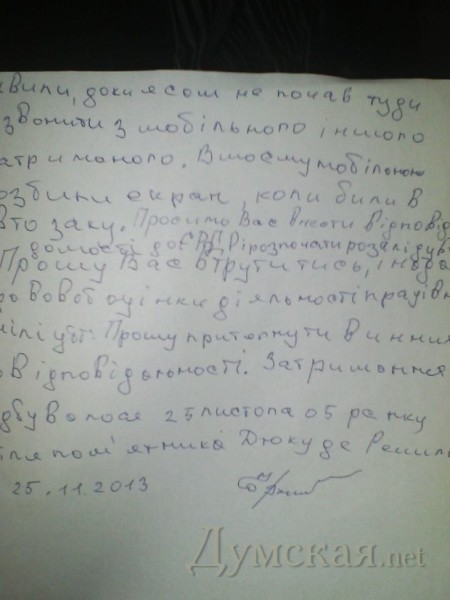 «Меня били в автозаке дубинкой, — говорится в документе, — били в живот, об пол. Закрывали рот руками и прижимали к полу, чтобы не хватало кислорода…. Били дубинкой через проем в двери, после чего прижали и прямо в лицо слезоточивым газом и закрыли двери. Чуть не задохнулся. Стало болеть сердце. В моем мобильном разбили экран, когда били в автозаке. Прошу вас вмешаться и дать правовую оценку действиям работников милиции…»