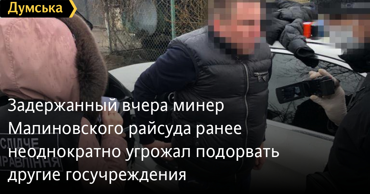 Задержанный вчера «минер» Малиновского райсуда ранее неоднократно угрожал подорвать другие госучрежденияЗадержанный вчера 38-летний «телефонный террорист», который оставил заведомо ложное сообщение о бомбе в Малиновском районном суде Одессы, ранее системно сообщал о псевдоминированиях госструктур и коммерческих помещений. Об этом сообщили в Управлении СБУ в Одесской области. Напомним, также мужчина является фигурантом уголовного производства по фактам мошенничества в особо крупных размерах. «Бомбист» угрожал подорвать суд, чтобы сорвать судебное заседание по этому делу. СМЕРТЬ РОСІЙСЬКИМ ОКУПАНТАМ! Помітили помилку? Виділяйте слова з помилкою та натискайте control-enter Новини по цій темі: 7 листопада 2022: В Одесі телефонний терорист повідомив про бомбу у суді 28 березня 2022: Жителя Одесской области задержали за ложное минирование эвакопоезда 26 січня 2022: В Одессе полиция задержала школьника, который сообщил о «минировании» учебного заведения (видео) 24 січня 2022: В Одессе "заминировали" все школы и торговые центры 18 січня 2022: "Удачных поисков, федералы!": к новому всплеску "телефонного терроризма" причастны россияне 18 січня 2022: В одесском аэропорту искали бомбу 13 січня 2022: В Одессе четвертый раз за неделю минируют торговые центры |