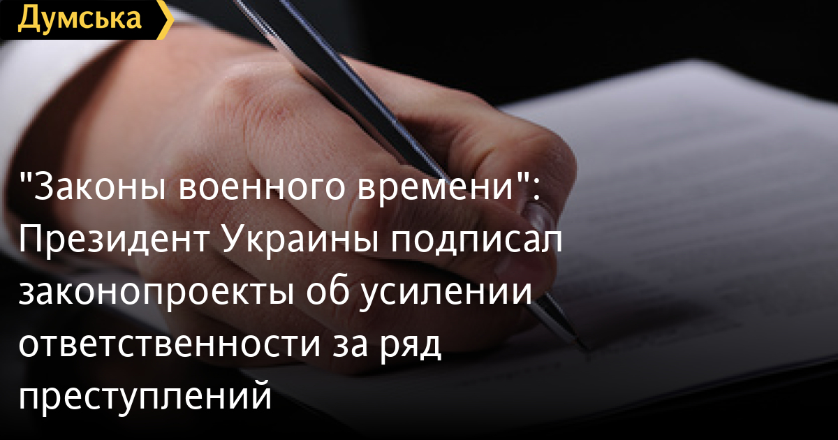 «Законы военного времени»: Президент Украины подписал законопроекты об усилении ответственности за ряд преступленийЦелый ряд законов, ранее принятых Верховной Радой, подписал президент Украины на этой неделе. Об этом сообщает профильный комитет Верховной Рады. В частности, речь идет об усилении ответственности за отдельные преступления, совершенные в условиях военного положения. В частности, будет усилена ответственность за диверсию и государственную измену — вплоть до пожизненного заключения с обязательной конфискацией всего имущества. За мародерство (кражи, грабежи, разбои, вымогательства, растраты) в условиях военного положения предусмотрена ответственность в виде лишения свободы от 5 до 15 лет. Еще одним законом обеспечивается возможность осуществления правосудия. Если в силу объективных причин в военное время у следователя нет возможности обратиться к следственному судье для получения нужных процессуальных решений по воинским преступлениям, их сможет принимать прокурор. В частности, в таком порядке могут приниматься решения о содержании под стражей и получении разрешений на различные следственные действия. Наконец, Закон Украины «Про забезпечення участі цивільних осіб у захисті України» позволяет гражданским использовать свое или полученное у государства оружие для обороны Украины. Порядок выдачи оружия с государственных складов гражданам в случае войны будет утвержден Министерством внутренних дел Украины. Отметим, что указанные законы вступят в силу после официальной публикации. СМЕРТЬ РОССИЙСКИМ ОККУПАНТАМ! Заметили ошибку? Выделяйте слова с ошибкой и нажимайте control-enter |