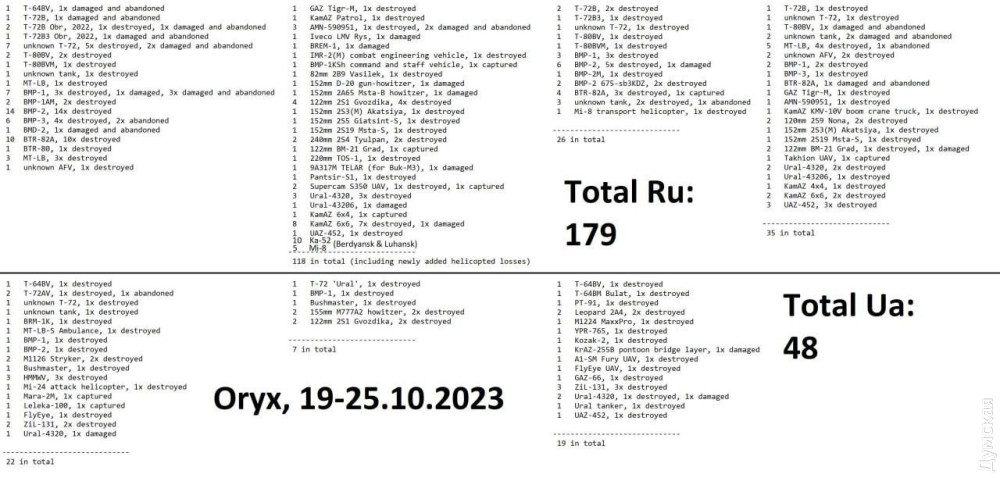 За їхніми даними, під час спроб ворогів прорвати позиції Сил оборони й оточити Авдіївку з 19 до 25 жовтня армія рф втратила 30 танків, 48 важких гусеничних броньованих машин (БМП і БМД), а також 33 одиниці легкої колісної бронетехніки — загалом 111 штук.