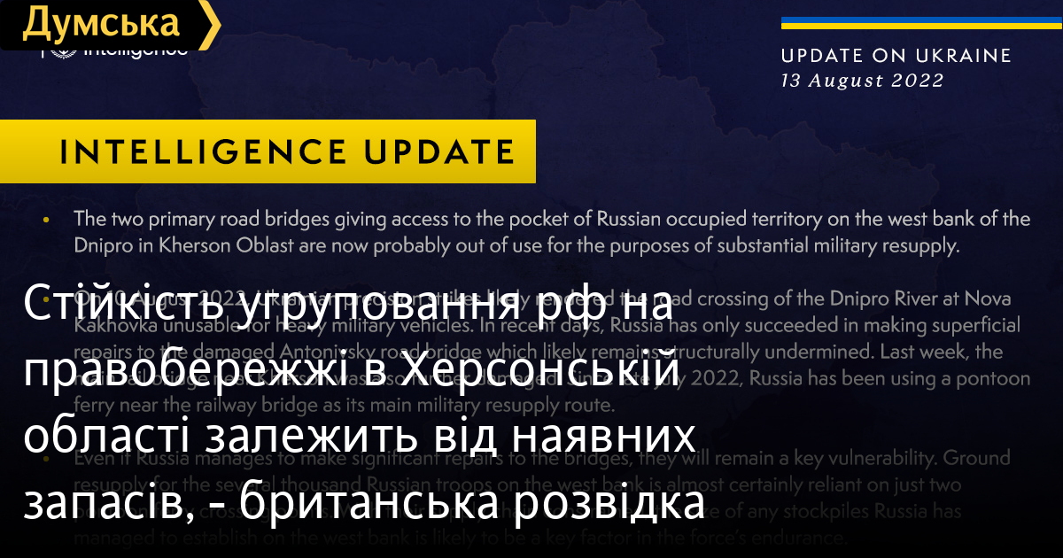 Зазначається, що два основні автомобільні мости, що ведуть до окупованої частини в Херсонській області на західному березі Дніпра, зараз, ймовірно, не використовуються для значного військового постачання.Високоточні удари українських військових 10 серпня, скоріш за все, зробили переправу через Дніпро у Новій Каховці непридатною для проїзду важкої військової техніки.В останні дні росії вдалося провести лише поверховий ремонт пошкодженого Антонівського мосту, який, ймовірно, залишається структурно пошкодженим, йдеться в огляді.Крім того, минулого тижня додатково пошкоджено магістральний залізничний міст під Херсоном.«З кінця липня 2022 року росія використовує понтонну переправу біля залізничного мосту як основний шлях постачання військових. Навіть якщо росії вдасться істотно відремонтувати мости, вони залишаться ключовою вразливістю. Наземне забезпечення кількох тисяч російських військових на західному березі майже напевно залежить лише від двох понтонних переправ», — йдеться в огляді.Обмежений ланцюжок поставок, ймовірно, робить розмір будь-яких запасів, які росії вдалося створити на західному березі, ключовим фактором витривалості сил, резюмують у британській розвідці.