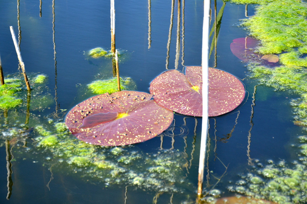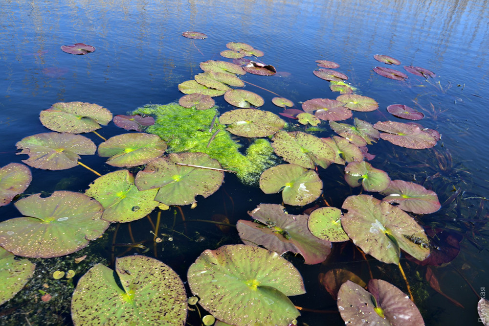 Белых лилий на воде еще нет, лишь прошлогодние кожистые диски растений, изрядно порыжевшие и покрывшиеся желтыми крапинками, живописно оттеняют синеву воды. Свою часть красок в насыщенность озера вносит и отражающаяся в воде лазурь неба.