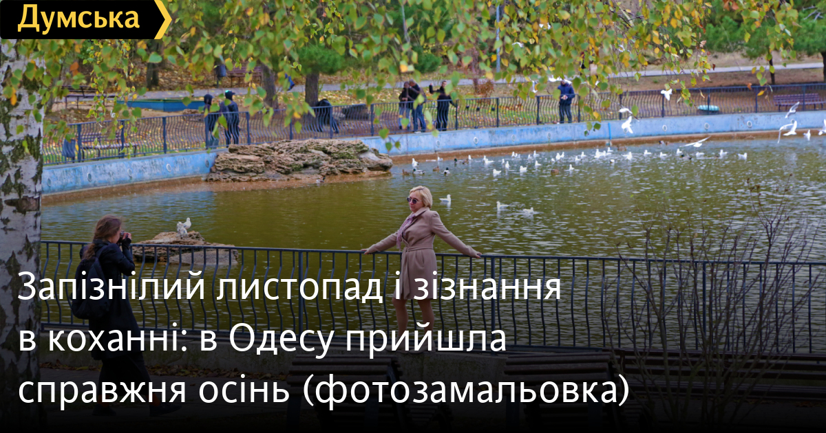 Разом із першим холодним дощем до нашого міста прийшла справжня осінь. Цього року червоно-жовті барви запізнилися на кілька тижнів. Сильний західний вітер влаштував деревопад, а водойми в парках і скверах наповнилися опалим листям. Холодного недільного дня одесити не поспішають на прогулянку — лише дехто наважився у вітряну погоду погодувати чайок і відчути швидке наближення зими. Але романтичні натури не сидять удома — деякі все ж таки влаштовують у парках фотосесії та освідчення в коханні. Фото Сергія Смоленцева СМЕРТЬ РОСІЙСЬКИМ ОКУПАНТАМ! Помітили помилку? Виділяйте слова з помилкою та натискайте control-enter |