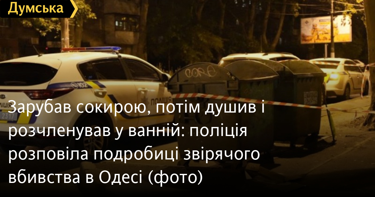Зарубав сокирою, потім душив і розчленував у ванній: поліція розповіла подробиці звірячого вбивства в ОдесіПоліція повідомила подробиці вбивства і розчленування одеситки, голову та інші фрагменти тіла якої ввечері 31 травня знайшли в сміттєвих баках на Сегедській. У ГУНП підтвердили інформацію про те, що 39-річний одесит по-звірячому вбив свою 60-річну матір. Під час сварки вдома у матері вбивця завдав їй безліч ударів сокирою по голові, а коли вона впала — душив її, щоб переконатися, що вона померла. Після цього він відтягнув тіло у ванну і розчленував, розфасувавши фрагменти по сміттєвих пакетах. Наступного дня він повернувся до квартири, забрав пакети і викинув у сміттєві баки. Затриманого помістили в СІЗО. Йому загрожує до 15 років в'язниці або довічний термін. Помітили помилку? Виділяйте слова з помилкою та натискайте control-enter Новини по цій темі: 29 липня 2025: В Усатово Одеської області сталася перестрілка: поліція працює на місці (відео, оновлено) 28 липня 2025: П'яний на "Ягуарі" або гіпертонік? Звільнений топ-посадовець одеської поліції хоче повернутися на службу 19 червня 2025: Дівчинку, яку шукали сотні одеситів, знайшли вбитою: поліція працює з чоловіком, ймовірно причетним до загибелі 27 травня 2025: Увели гектар в університету: на Одещині засудили земельних аферистів, але без посадки і Хвоста |